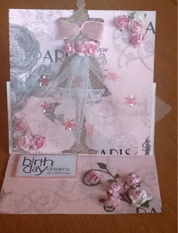 I dressed up the dressmakers dummy with some tuille, ribbon, and flowers and added a sentiment to finish.